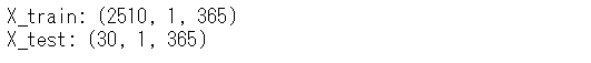 X_trainが(samples=2510, time_steps=1, features=365)で、X_testが(samples=30, time_steps=1, features=365)ということです。