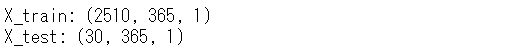 X_trainが(samples=2510, time_steps=365, features=1)で、X_testが(samples=30, time_steps=365, features=1)ということです。