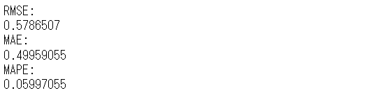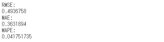 今回の予測精度の評価指標も前回と同じで、RMSE(二乗平均平方根誤差、Root Mean Squared Error)とMAE(平均絶対誤差、Mean Absolute Error)、MAPE(平均絶対パーセント誤差、Mean absolute percentage error)を使います。