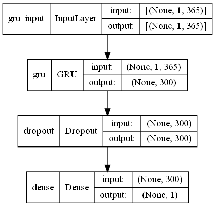 # モデル定義 model = Sequential() model.add(GRU(300,input_shape=(X_train.shape[1], X_train.shape[2]))) model.add(Dropout(0.2)) model.add(Dense(1, activation='linear')) # コンパイル model.compile(loss='mean_squared_error', optimizer='adam') # モデルの視覚化 plot_model(model,show_shapes=True)