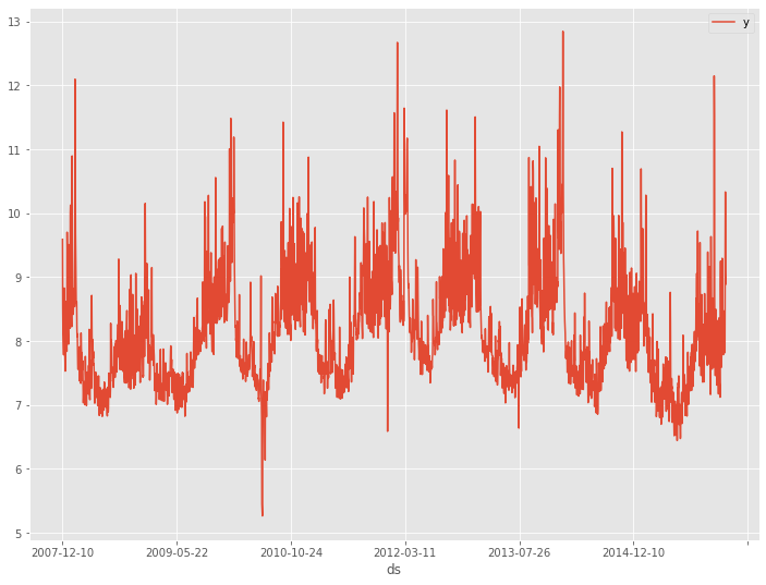 サンプルデータは、前回と同じPeyton ManningのWikipediaのPV(ページビュー)というProphetで提供されているサンプルデータ(example_wp_log_peyton_manning.csv)を使います。