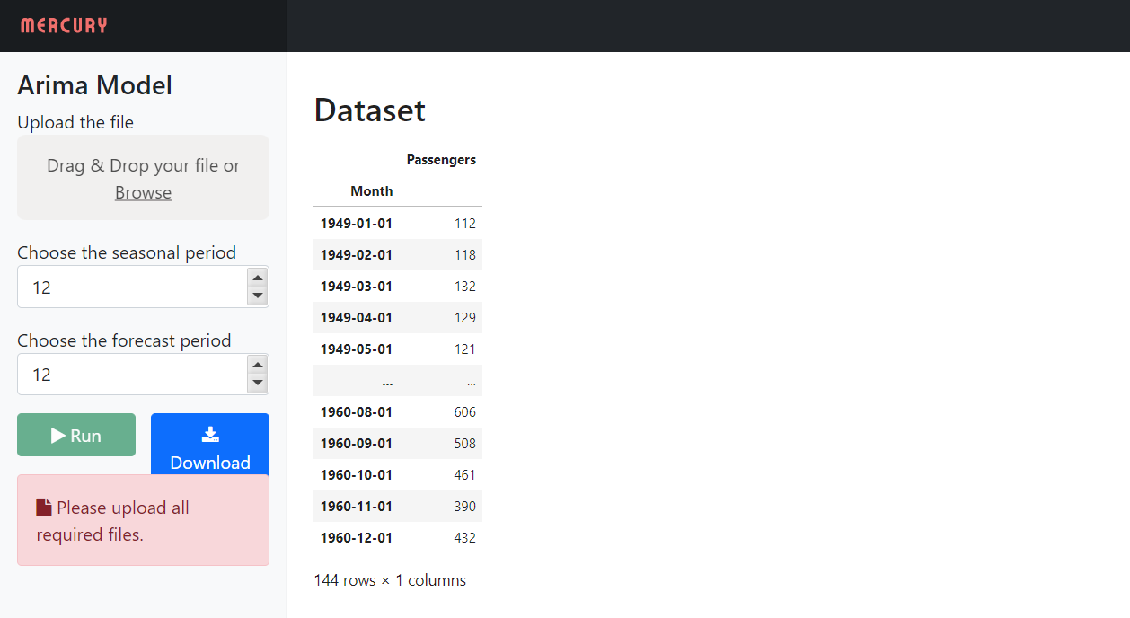 時系列データ(CSVファイル)をアップロード、季節成分の周期(seasonal)と予測する未来の期間(forecast)を設定し、Runボタンをクリックします。