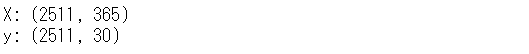 X_trainが(samples=2411, time_steps=365, features=1)で、X_testが(samples=100, time_steps=365, features=1)ということです。