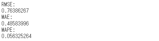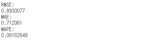 今回の予測精度の評価指標も前回と同じで、RMSE(二乗平均平方根誤差、Root Mean Squared Error)とMAE(平均絶対誤差、Mean Absolute Error)、MAPE(平均絶対パーセント誤差、Mean absolute percentage error)を使います。
