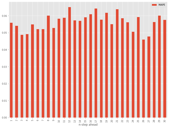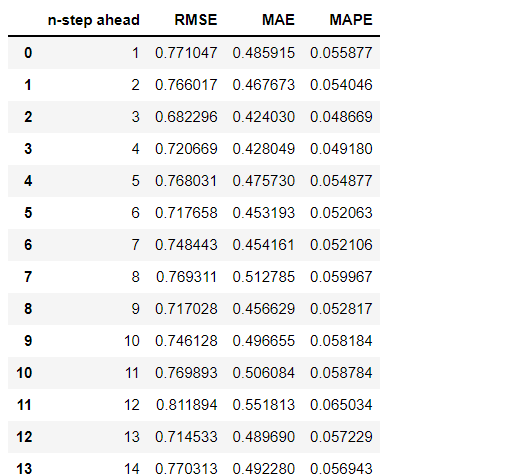 testResult = pd.DataFrame(testResult, columns=(['n-step ahead','RMSE','MAE','MAPE']))