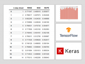 前回までは、simpleRNN・LSTM・GTUでモデル構築し1期先予測(1-Step ahead prediction)の方法について説明しました。 以下の記事は、simpleRNNでモデル構築し1期先予測(1-Ste … 続きを読む Python Keras(TensorFlow)で作る