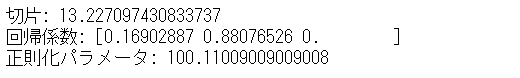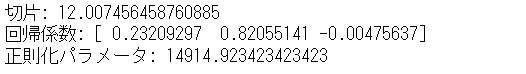 学習結果である回帰係数(定数含む)とハイパーパラメータを出力します。