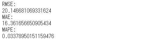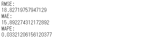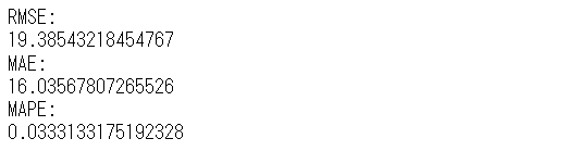 今回の予測精度の評価指標は、RMSE(二乗平均平方根誤差、Root Mean Squared Error)とMAE(平均絶対誤差、Mean Absolute Error)、MAPE(平均絶対パーセント誤差、Mean absolute percentage error)を使います。