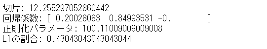 Elastic Net回帰は、Ridge回帰とLasso回帰のハイブリッドモデルです。ハイパーパラメータとして、その割合を設定する必要があります。もちろん、ハイパーパラメータとして、正則化項の重み(正則化パラメータ)を設定する必要があります。