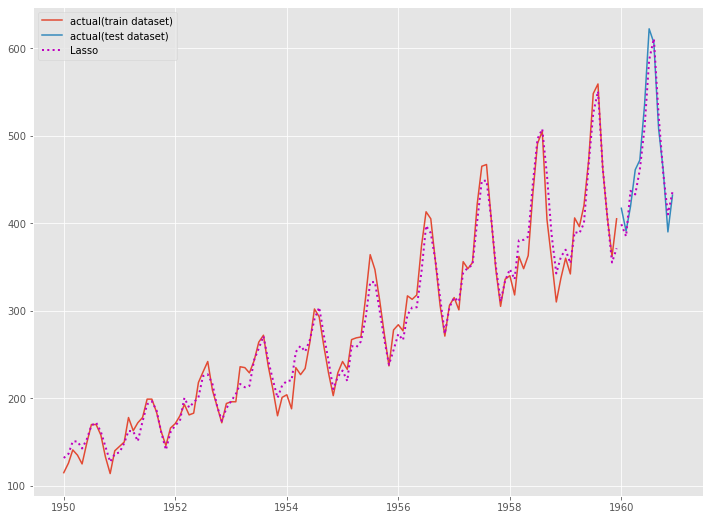# グラフ化 fig, ax = plt.subplots() ax.plot(y_train.index, y_train.values, label="actual(train dataset)") ax.plot(y_test.index, y_test.values, label="actual(test dataset)") ax.plot(y_train.index, train_pred, linestyle="dotted", lw=2,color="m") ax.plot(y_test.index, test_pred, label="Lasso", linestyle="dotted", lw=2, color="m") plt.legend()