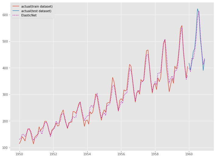 # グラフ化 fig, ax = plt.subplots() ax.plot(y_train.index, y_train.values, label="actual(train dataset)") ax.plot(y_test.index, y_test.values, label="actual(test dataset)") ax.plot(y_train.index, train_pred, linestyle="dotted", lw=2,color="m") ax.plot(y_test.index, test_pred, label="ElasticNet", linestyle="dotted", lw=2, color="m") plt.legend()