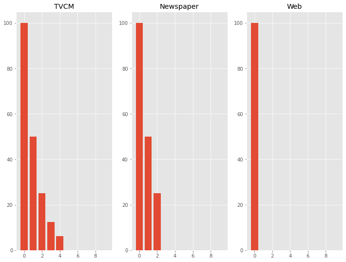 飽和効果(収穫逓減)やキャリーオーバー(Carryover)効果を考慮したモデルがいいでしょう。この2つを考慮した数値変換(変換器)の機能がアドストック(Ad Stock)です。