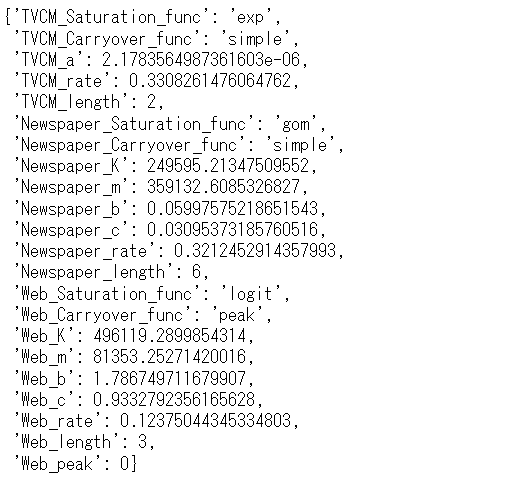 Optunaで最適な飽和モデルとキャリーオーバー効果モデルの組み合わせを探しつつ、それぞれのモデルのハイパーパラメータチューニングをします。