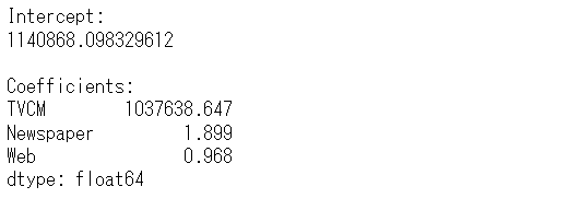 どのような線形回帰モデルなのか(切片と回帰係数)を見てみます。