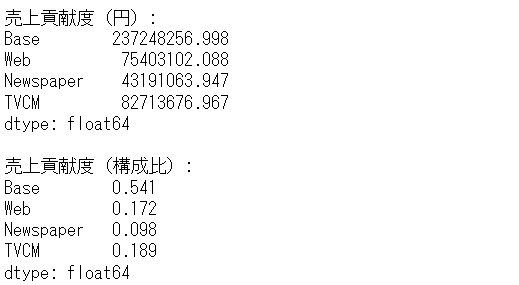# 各媒体のコストの合計 cost_sum = X.sum(axis=0) cost_sum #確認