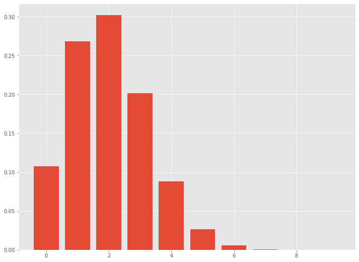 Pythonで二項分布を描いてみます。SciPyを使います。10回試行、成功確率0.2の二項分布です。