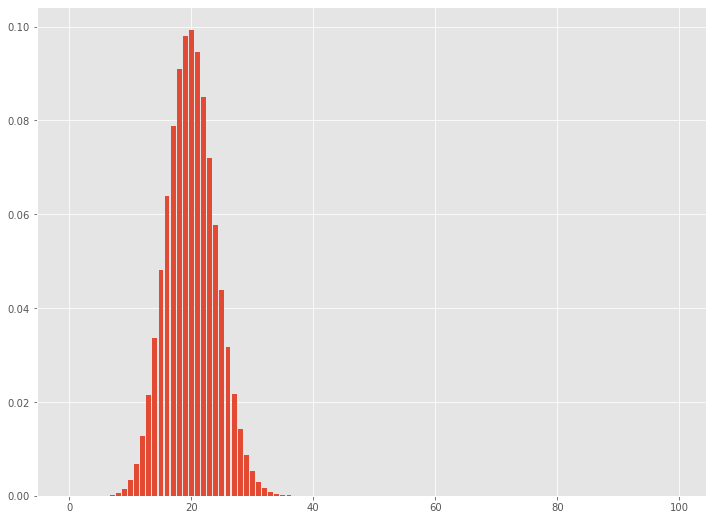 ## 計算 n = 100 #試行回数 p = 0.2 #成功確率 x = range(n) #x軸 f = binom(n, p) #確率分布 y = f.pmf(x) #y軸 ## グラフ plt.bar(x, y)