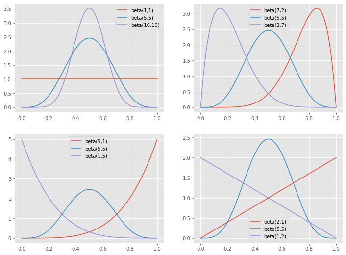 # x軸 x = np.linspace(0, 1, 100) # グラフ1 plt.subplot(2, 2, 1) plt.plot(x, beta.pdf(x, 1, 1), label='beta(1,1)') plt.plot(x, beta.pdf(x, 5, 5), label='beta(5,5)') plt.plot(x, beta.pdf(x, 10, 10), label='beta(10,10)') plt.legend() # グラフ2 plt.subplot(2, 2, 2) plt.plot(x, beta.pdf(x, 7, 2), label='beta(1,1)') plt.plot(x, beta.pdf(x, 5, 5), label='beta(5,5)') plt.plot(x, beta.pdf(x, 2, 7), label='beta(10,10)') plt.legend() # グラフ3 plt.subplot(2, 2, 3) plt.plot(x, beta.pdf(x, 5, 1), label='beta(1,1)') plt.plot(x, beta.pdf(x, 5, 5), label='beta(5,5)') plt.plot(x, beta.pdf(x, 1, 5), label='beta(10,10)') plt.legend() # グラフ4 plt.subplot(2, 2, 4) plt.plot(x, beta.pdf(x, 2, 1), label='beta(1,1)') plt.plot(x, beta.pdf(x, 5, 5), label='beta(5,5)') plt.plot(x, beta.pdf(x, 1, 2), label='beta(10,10)') plt.legend() # グラフ表示 plt.show()