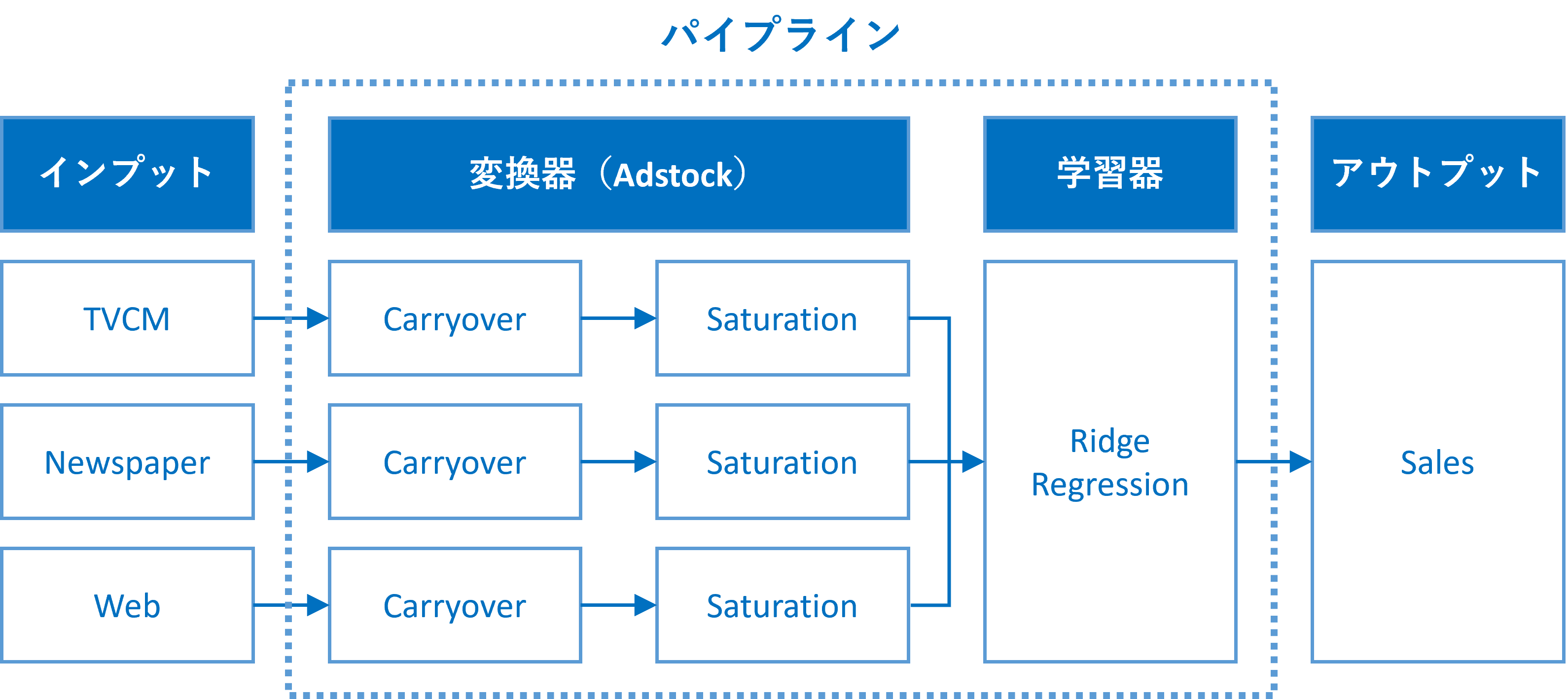 ちなみに、アドストック(Ad Stock)を考慮するとは、飽和効果(収穫逓減)キャリーオーバー(Carryover)効果を考慮するということです。具体的には、Pythonscikit-learn(sklearn)パイプラインを、以下のように構築しました。