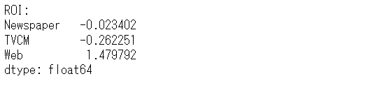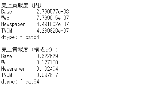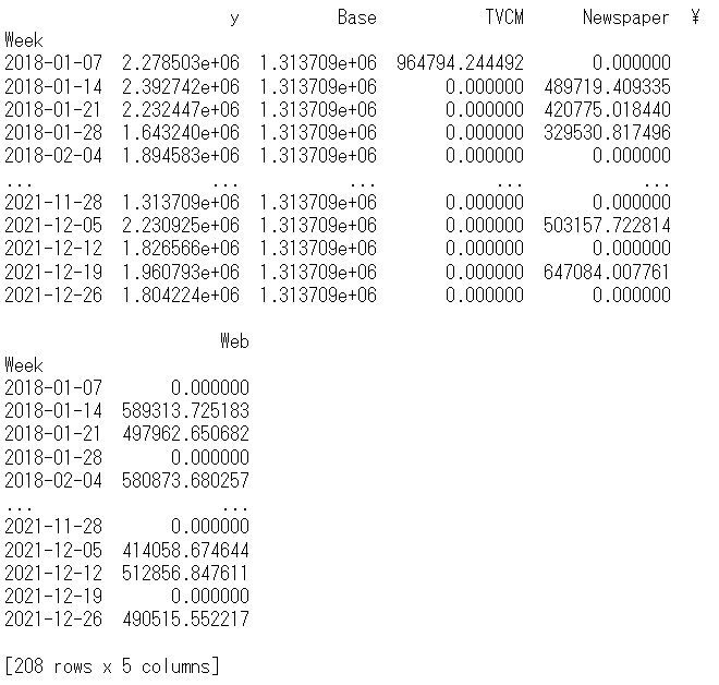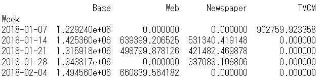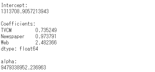 以下、実行結果です。y = Base + TVCM + Newspaper + Webです。