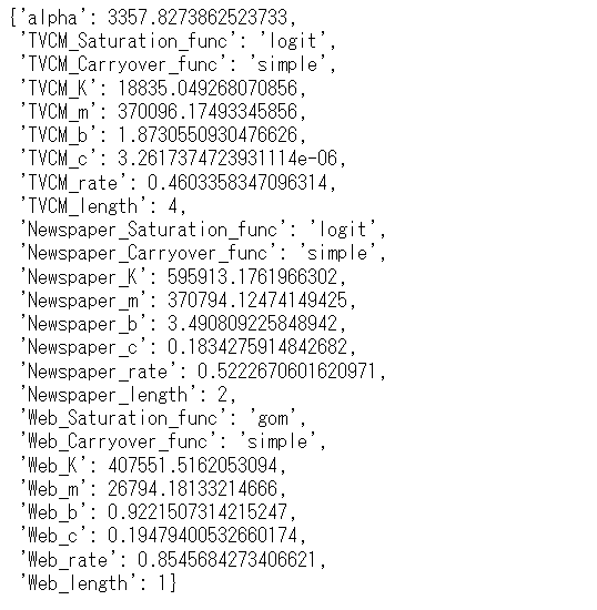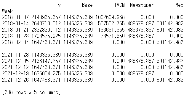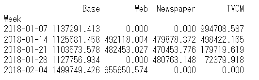 以下、実行結果です。y = Base + TVCM + Newspaper + Webです。