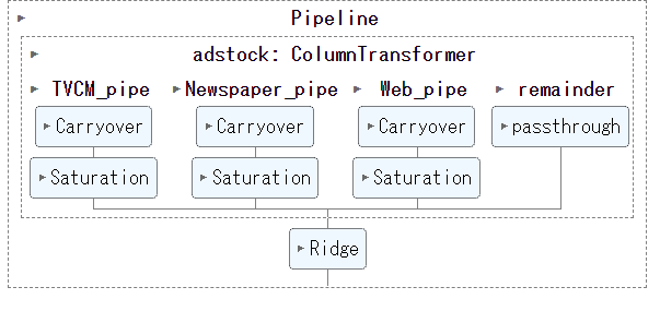 ちなみに、アドストック(Ad Stock)を考慮するとは、飽和効果(収穫逓減)とキャリーオーバー(Carryover)効果を考慮するということです。具体的には、Pythonのscikit-learn(sklearn)のパイプラインを、以下のように構築しました。