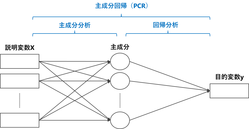 主成分回帰(PCR)とは、元の説明変数Xに対し主成分分析を実施し主成分得点(変換後のデータ)を求め、その主成分得点を使い線形回帰モデルを構築する手法です。要は、主成分分析×線形回帰という2つの数理モデルの組み合わせたものです。