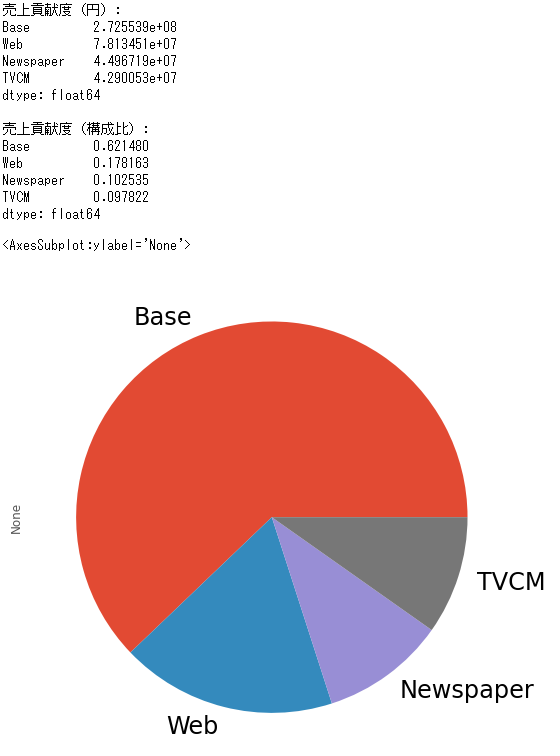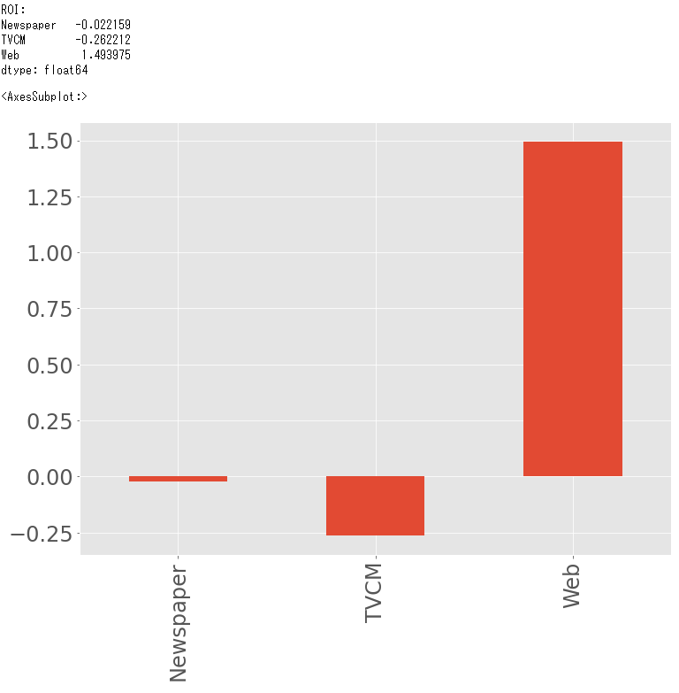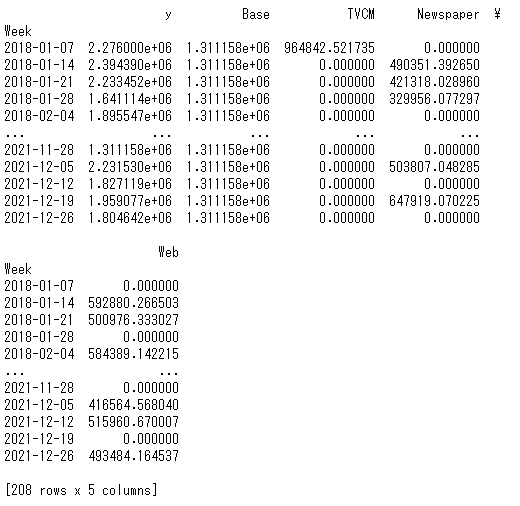 以下、実行結果です。y = Base + TVCM + Newspaper + Webです。