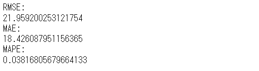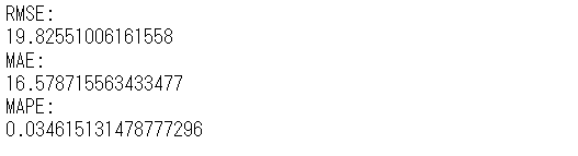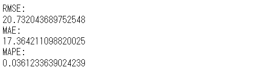 今回の予測精度の評価指標は、RMSE(二乗平均平方根誤差、Root Mean Squared Error)とMAE(平均絶対誤差、Mean Absolute Error)、MAPE(平均絶対パーセント誤差、Mean absolute percentage error)を使います。