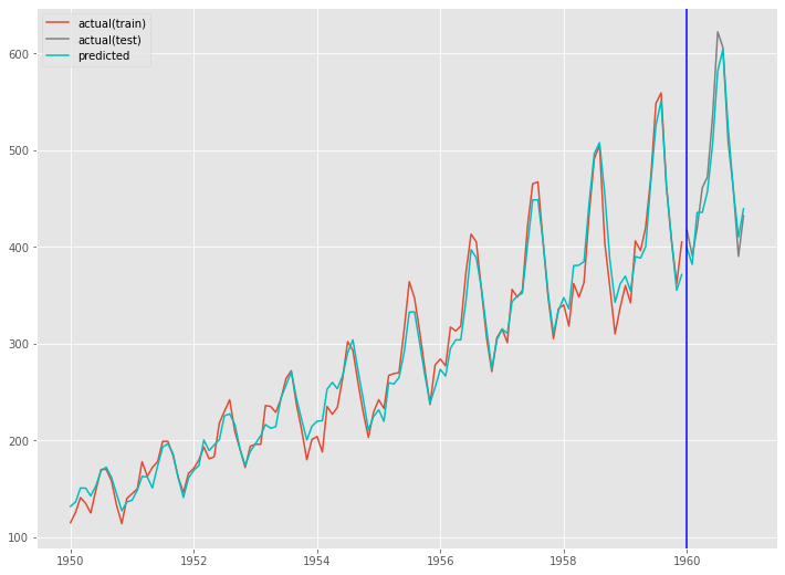 fig, ax = plt.subplots() ax.plot(train.index, y_train, label='actual(train)') ax.plot(test.index, y_test, label='actual(test)', color='gray') ax.plot(train.index, train_pred, color='c') ax.plot(test.index, test_pred, label="predicted", color="c") ax.axvline(datetime.datetime(1960,1,1),color='blue') ax.legend() plt.show()