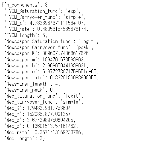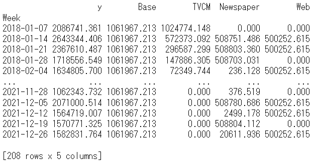 以下、実行結果です。y = Base + TVCM + Newspaper + Webです。