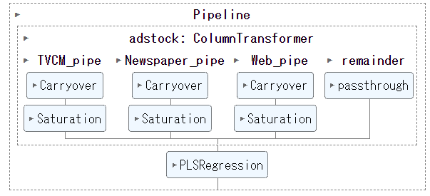 ちなみに、アドストック(Ad Stock)を考慮するとは、飽和効果(収穫逓減)とキャリーオーバー(Carryover)効果を考慮するということです。具体的には、Pythonのscikit-learn(sklearn)のパイプラインを、以下のように構築しました。