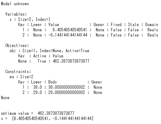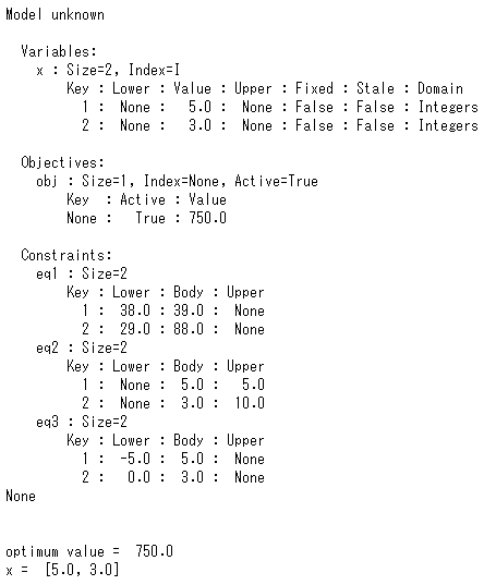 変数に範囲制約をつけた場合の、最適化モデルの生成と実行です。