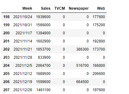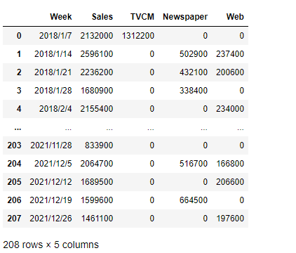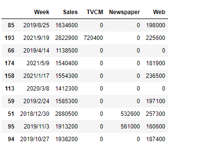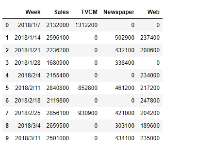 # # CSVファイルをデータフレームとして読み込む # # 読み込むファイル名(データのあるURLを指定) file = "https://www.salesanalytics.co.jp/4zdt" # CSVファイルの読み込み df = pd.read_csv(file) df #確認