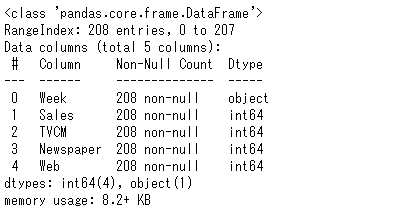 データセットのサマリーです。以下、コードです。infoメソッドで出力します。