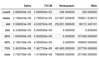 どのようなデータセットなのかを理解するには、生のデータセットを見るだけでなく、カラム(変数)の基礎統計(平均値など)を計算し見ることも大事です。