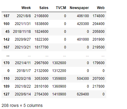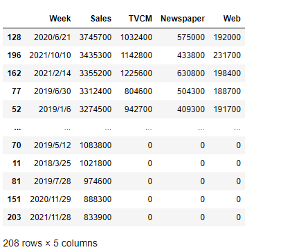 # 降順 df.sort_values(by="Sales", ascending=False)