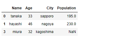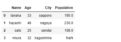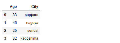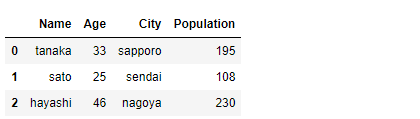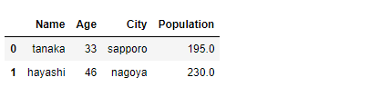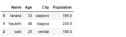 # df2にCityをキーにdf1のデータを結合 df_merged2 = pd.merge(df1, df2, how="right", on="City") df_merged2 #確認