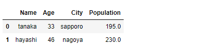 # df1にCityをキーにdf2のデータを結合 df_merged1 = pd.merge(df1, df2, how="left", on="City") df_merged1 #確認