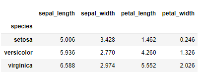 この基礎統計量を、カラム(変数)speciesの値別に集計するとき、groupbyメソッドを使います。