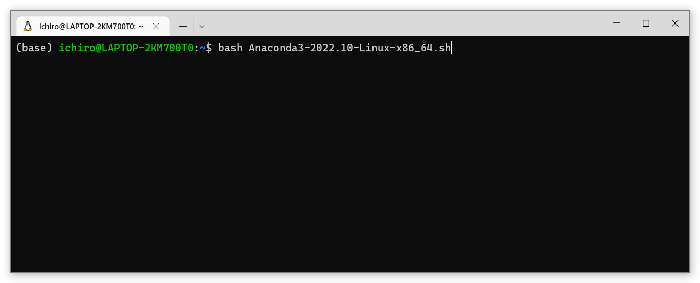 Ubuntu上で、以下のコマンドを記述し実行すると、ダウンロードしたAnaconda(Anaconda3-2022.10)のインストールが開始されます。