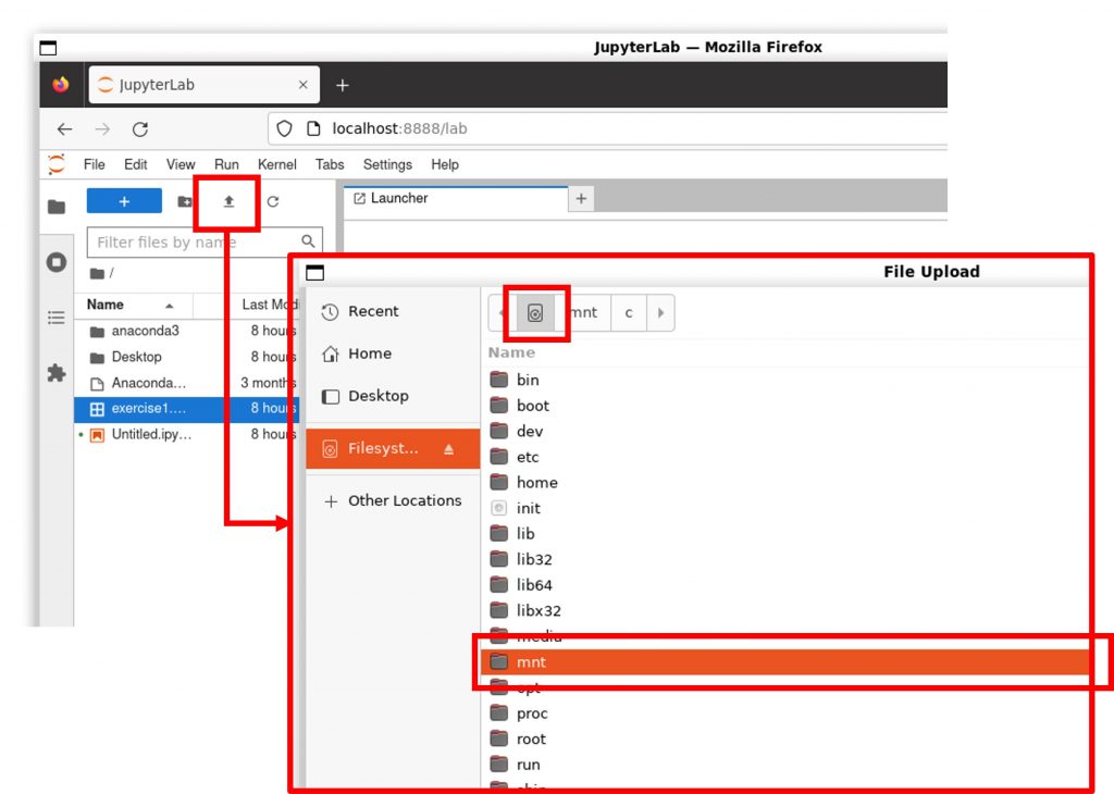 Jupyter Lab上で、Windows上のデータをアップロードするときには、Jupyter Lab上の「ファイルアップロード」(上矢印記号)をクリックすると「File Upload」画面が立ち上がりますので、そこでmnt経由でWindowsのCドライブにアクセスし、アップロードしたいファイルを選択します。
