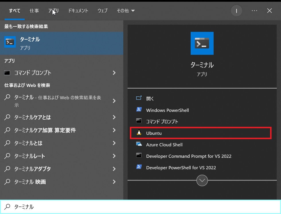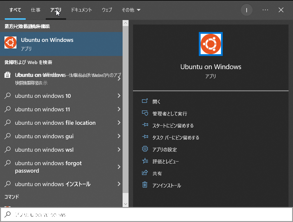 もし、促されないときは、Windows上のLinuxを直接立ち上げましょう。Ubuntu on Windowsというアプリがインストールされていますので、それを実行します。