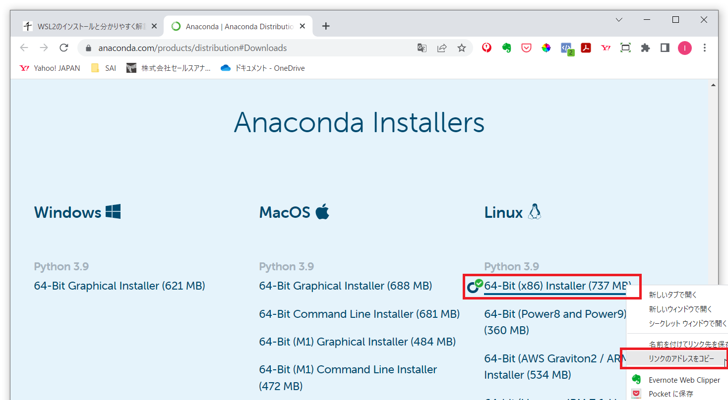 最新版のLinux版のAnaconda(Linux の 64-Bit (x86) Installer)のURLを取得します。