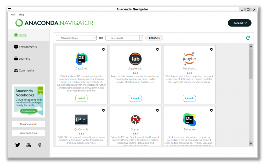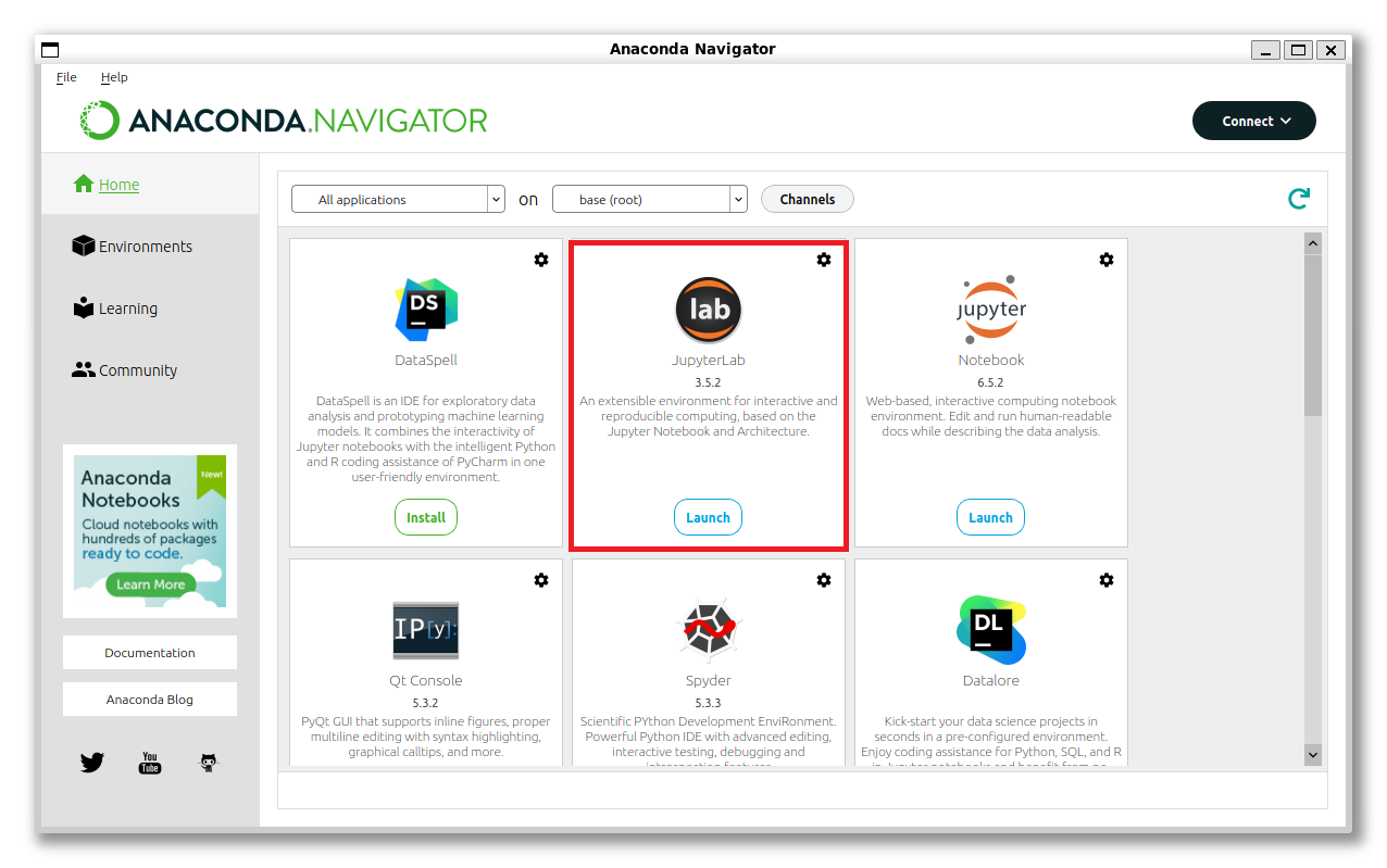 起動すると、anaconda-navigatorが立ち上がります。見て頂くとわかりますが、Windows版とほぼ同じです。ここで、Jupyter Labなどのアプリを立ち上げたり、ライブラリーや仮想環境を管理したりできます。