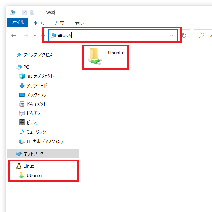 Windows側からLinux(Ubuntu)のデータへアクセスするときは、エクスプローラから直接いけます。