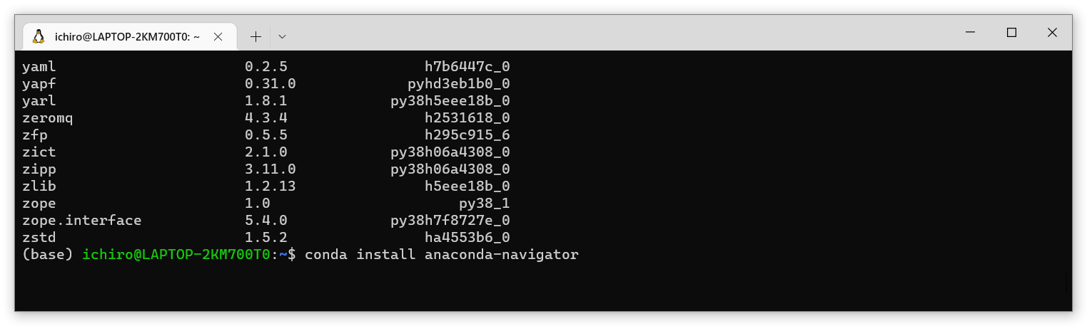 私の環境にはanaconda-navigatorが入っていなかったので、以下のコマンドを記述し実行することで、このライブラリー(パッケージ)をインストールします。