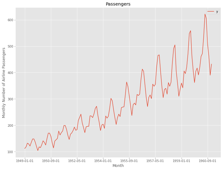 このデータセットも、説明変数のない目的変数が1変量の時系列データで、目的変数は月単位の飛行機乗客数です。
