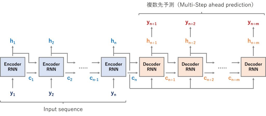 - 順伝播するRNNでEncoder層(RNN)とDecoder層(RNN)を構築し多層化する