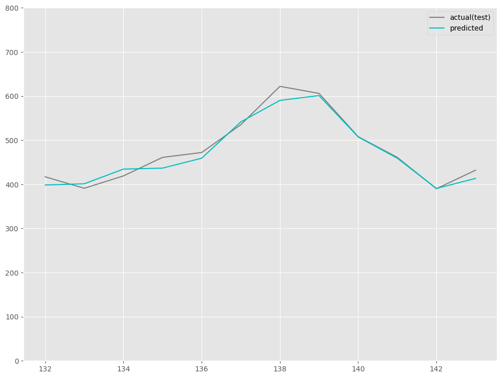 # # グラフ(予測値と実測値) # fig, ax = plt.subplots() ax.set_ylim([0, 800]) # 実測値の描写 ax.plot(df.index[-output_sequence:], df.y[-output_sequence:], label='actual(test)', color='gray') # 予測値の描写 ax.plot(df.index[-output_sequence:], test_pred, label="predicted", color="c") # 凡例表示 ax.legend() plt.show()